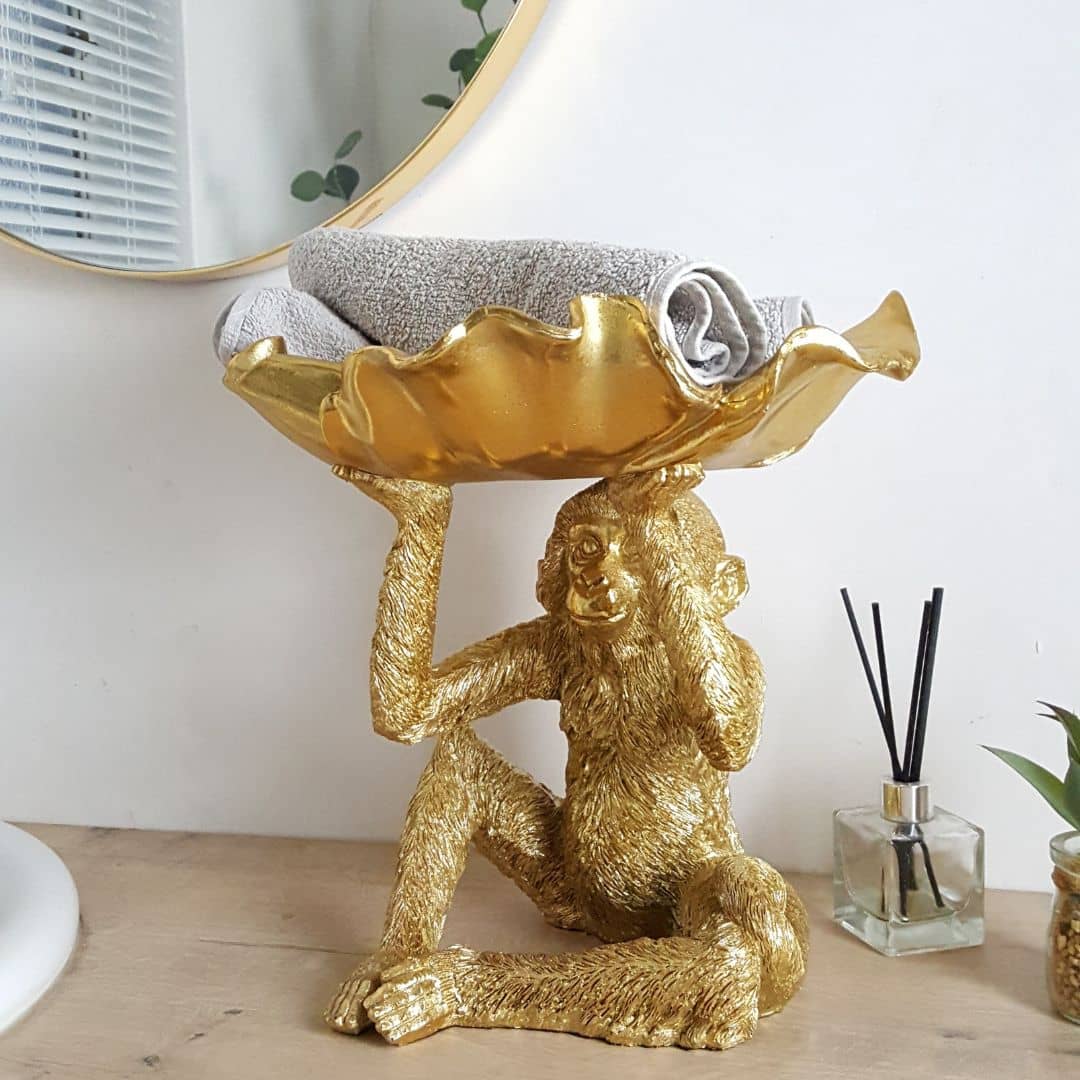 A perfect decorative bowl for adding a touch of luxury and whimsy to any room, whether showcasing small treasures or simply admired as a standalone gold monkey bowl. Crafted from durable resin, it brings a sophisticated and playful charm to your home decor.
