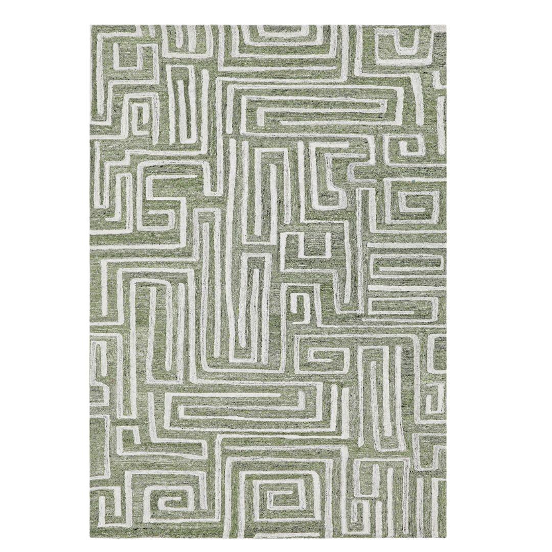 A geometric wool rug for modern living rooms that adds a refreshing touch of green to feature spaces. Hand-tufted from 100% premium wool, this modern area rug for contemporary homes showcases a maze-like design with a dense, plush pile. Perfect for grounding living rooms or open-plan areas, it combines style, texture, and comfort in one statement rug.