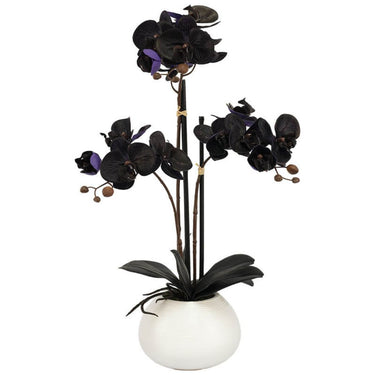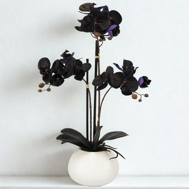 The Black Orchid in a ceramic Pot is a bold and elegant décor accent. Designed with rich black leaves touched with subtle purple tones, it features three upright stems for a lifelike display. The base is finished with natural-looking green leaves and housed in a textured white ceramic pot that complements any interior. Compact and versatile, this artificial black orchid is perfect for styling on shelves, in bathrooms, or as a statement accent in guest rooms.