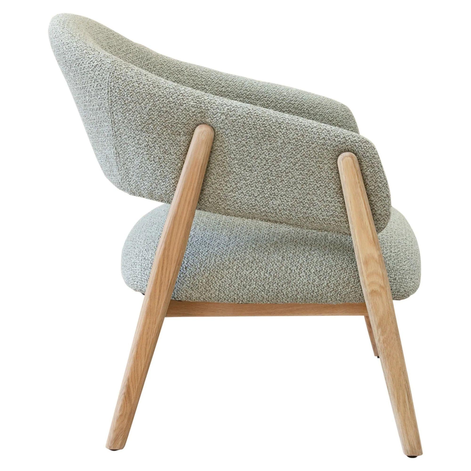 Lorenzo occasional chair brings style and comfort to any room. Its solid light oak frame showcases natural wood grain, while the curved backrest provides ergonomic support. The seat and backrest are padded and upholstered in soft green tone polyester, offering a cozy place to relax. Available in two versatile shades, this chair effortlessly complements living rooms, bedrooms, or reading nooks with its sophisticated, modern silhouette.