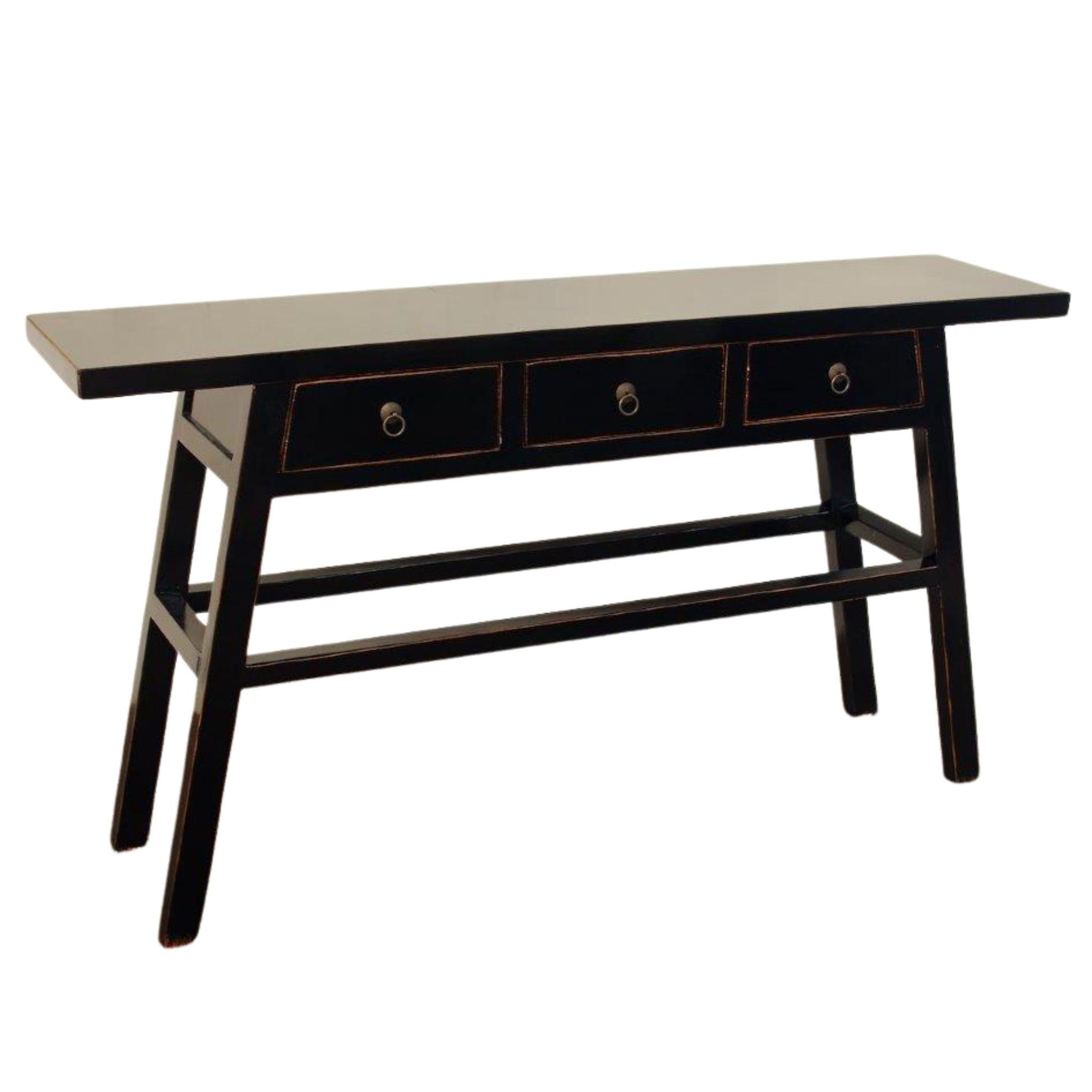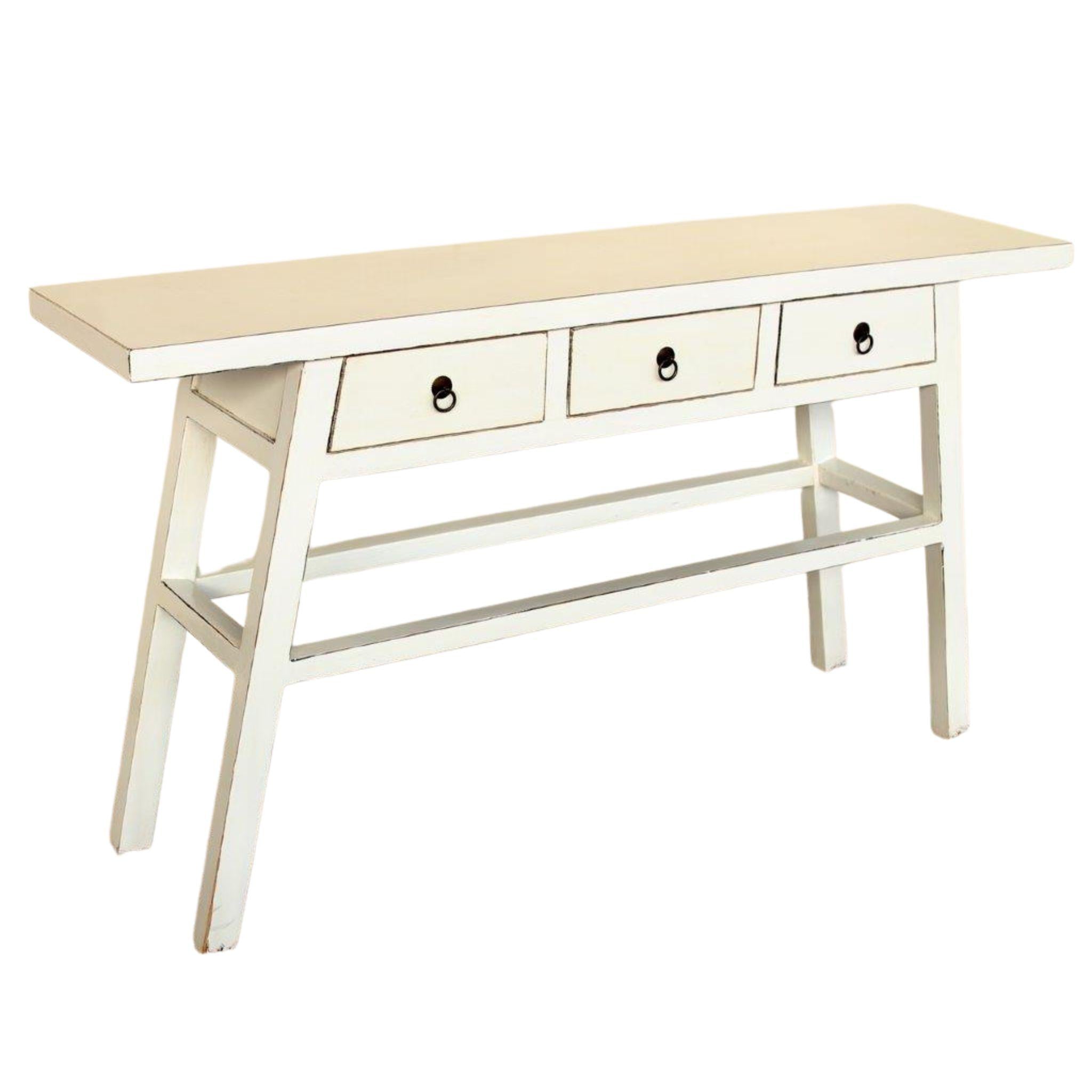 A striking statement console that blends old-world charm with modern elegance. The Maya Console Table is crafted from solid elmwood with a beautifully distressed finish that gives it authentic character and timeworn appeal. Three drawers with brass ring pulls offer practical everyday storage, while the sleek silhouette makes it perfect for entryways, living rooms, or behind a sofa.