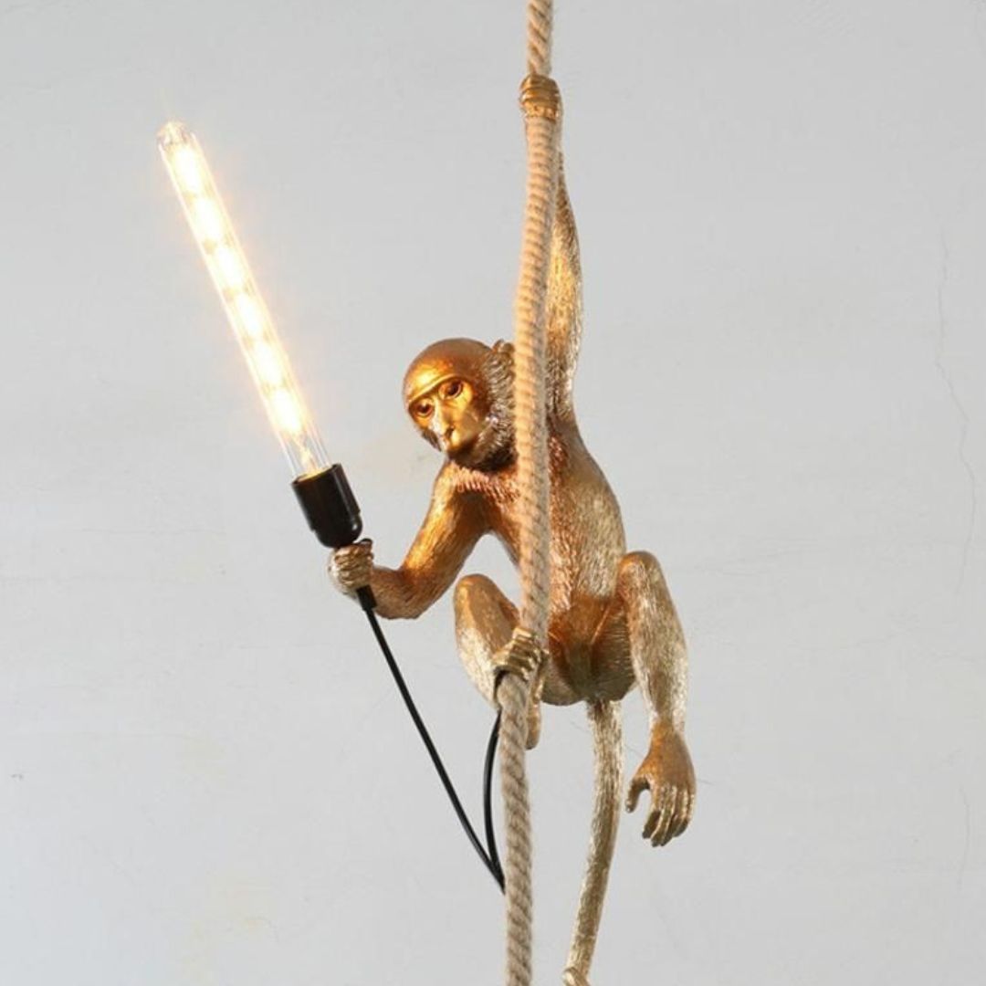 This charming pendant lamp features a sculpted monkey figure hanging from a rope while holding a light, bringing a sense of fun and whimsy to any room. Crafted from resin with intricate detailing, the monkey appears mid-climb, suspended from a thick rope while holding a light fitting. Its lifelike, textured surface enhances the sculptural charm, making it as much a decorative statement as it is a functional piece.