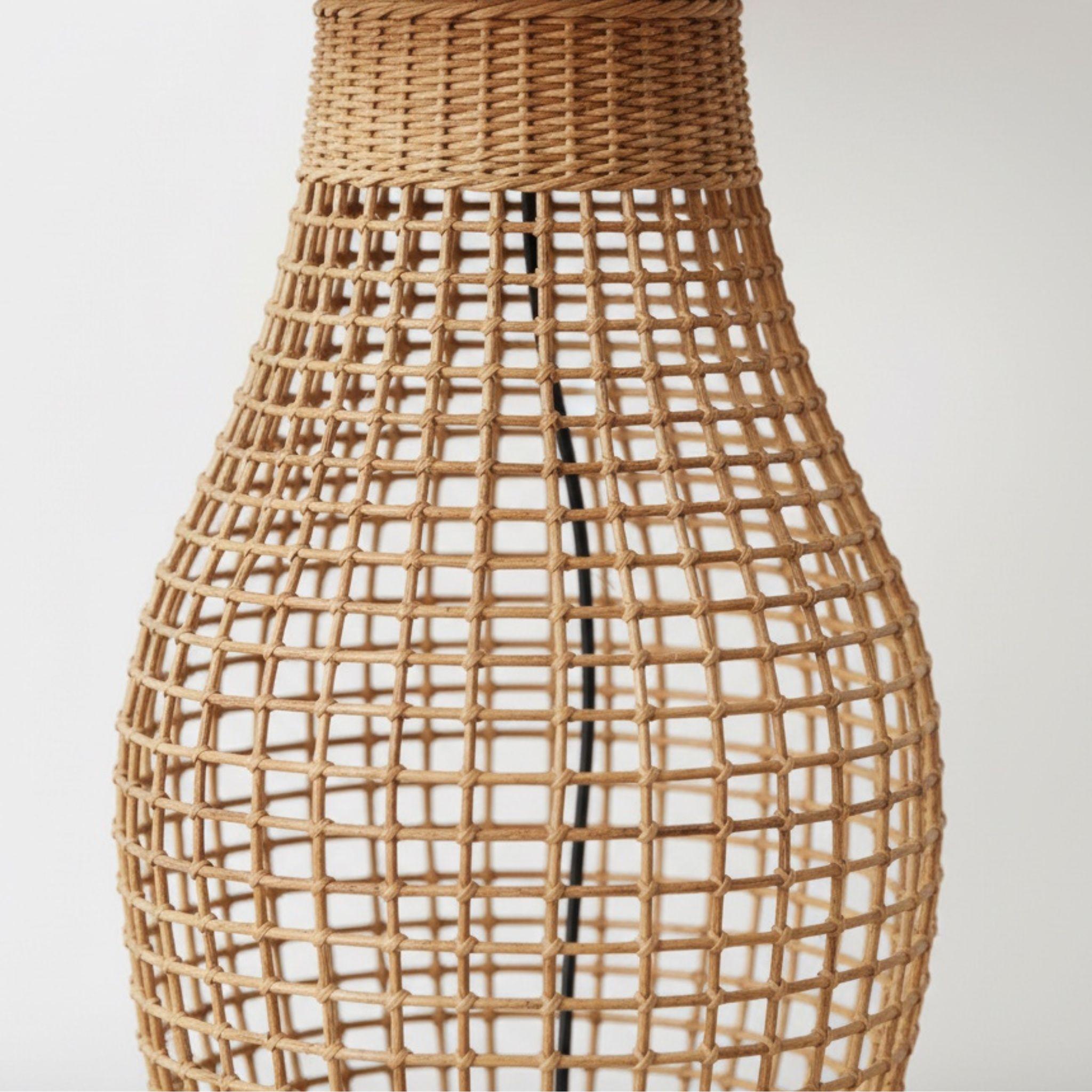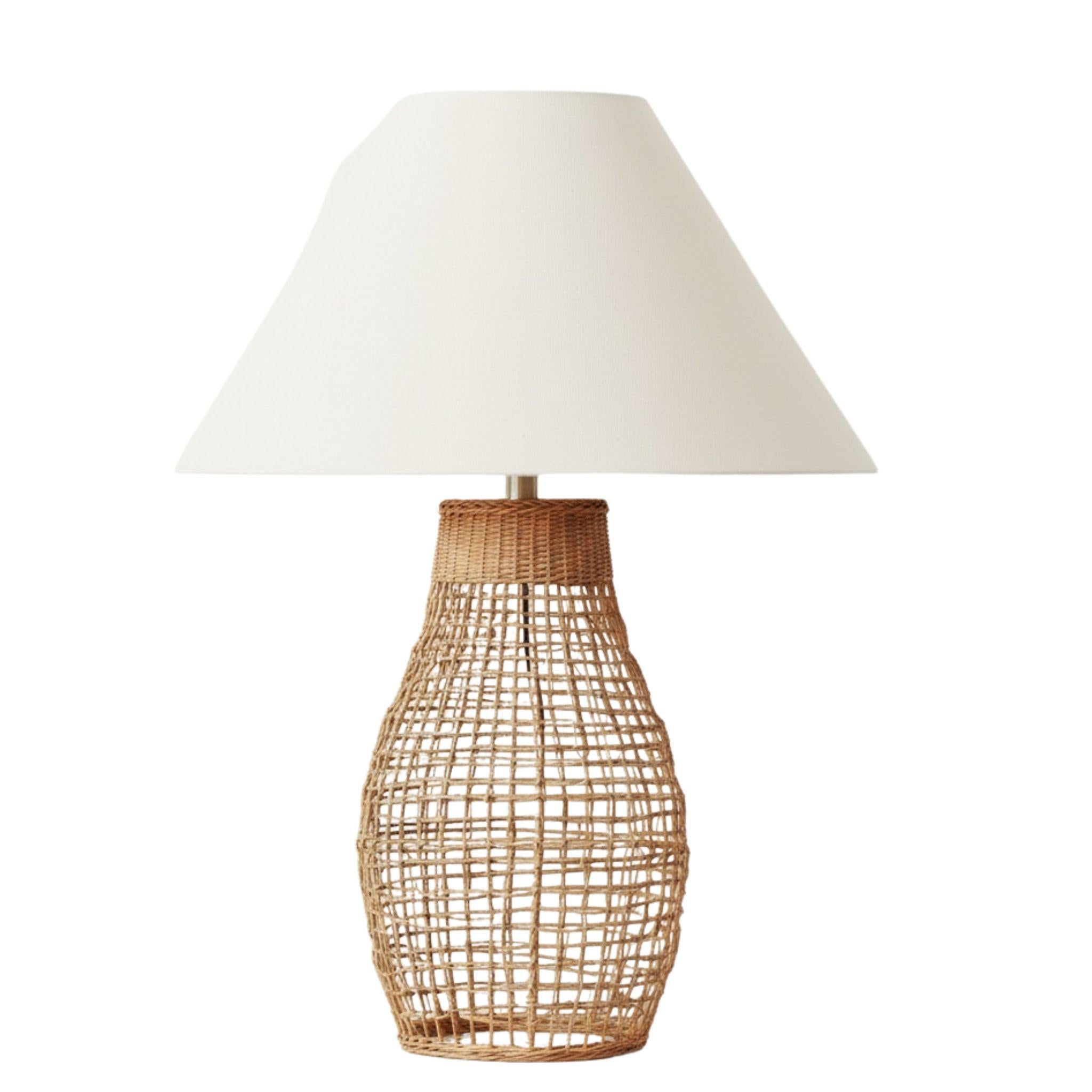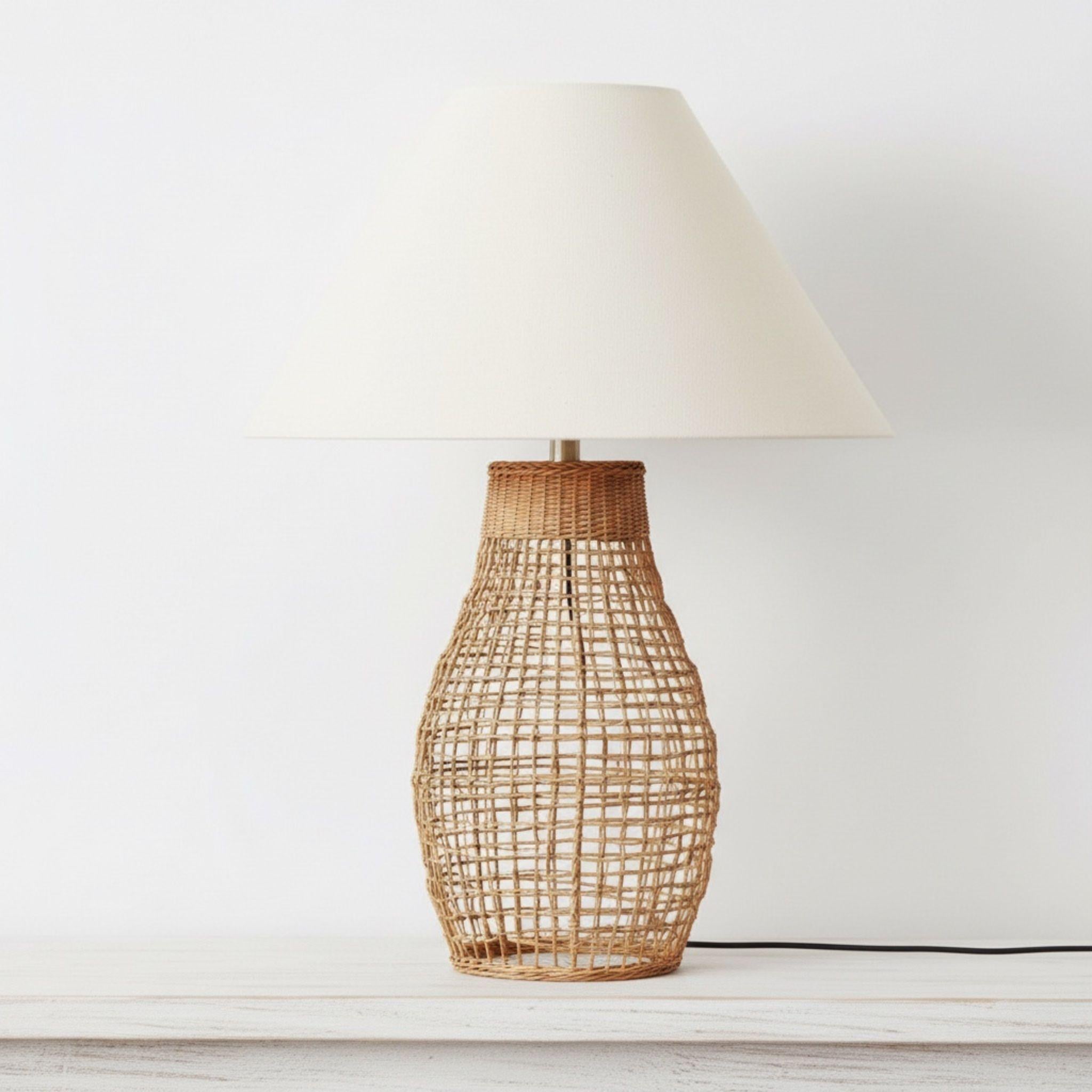 This rattan minimalist lamp features a stunning open-weave base that adds a light, airy feel to any surface. The organic texture and bell-like silhouette of the Sol Lamp make it a unique piece that perfectly embodies the essence of modern coastal living. The combination of hand-woven rattan cane and a crisp beige fabric shade ensures a warm, diffused glow throughout your space. This table lamp is an ideal choice for a natural home lighting aesthetic, bringing a touch of relaxed elegance to your interior.