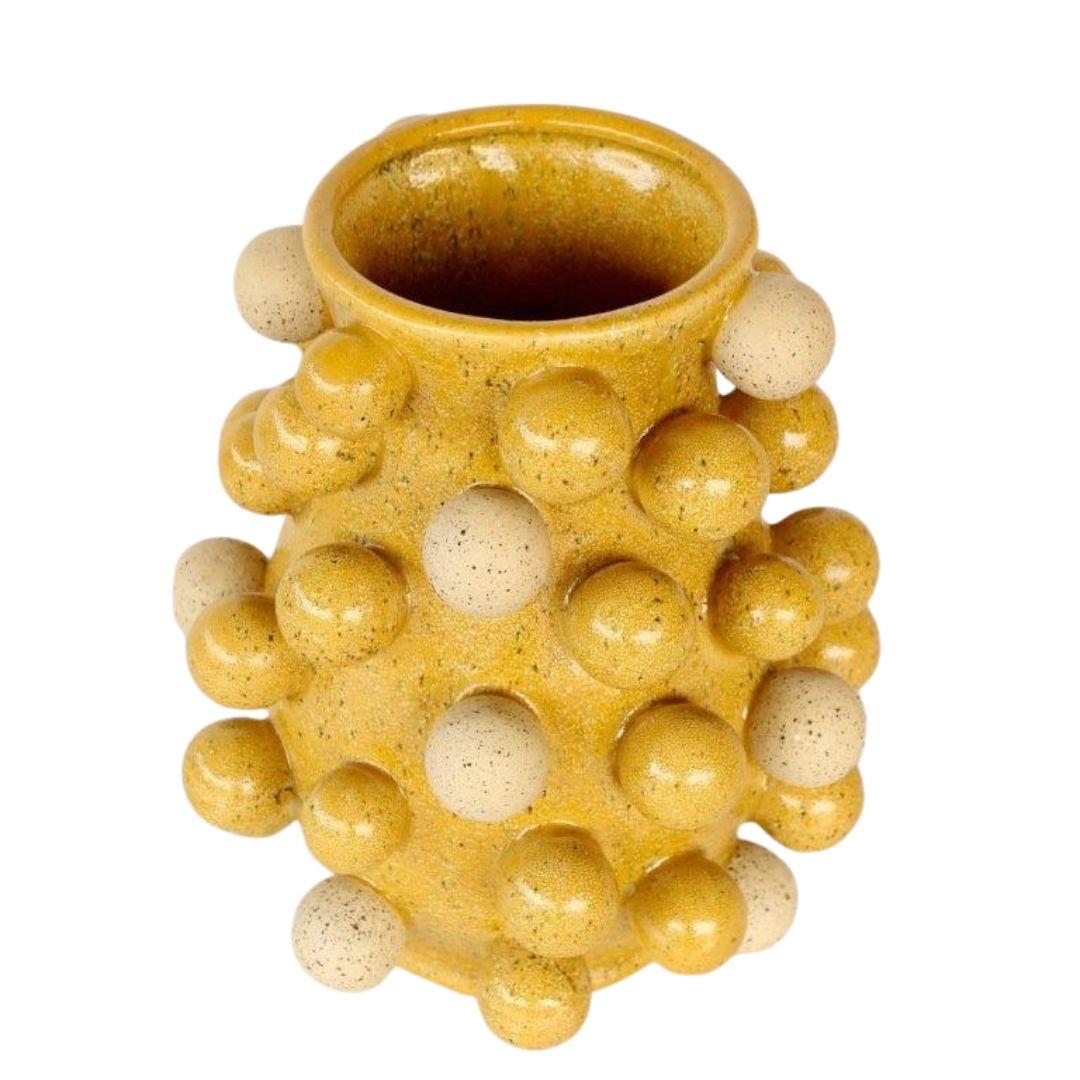 This decorative vase features a playful bobble texture across its ceramic body. Finished in yellow with subtle natural speckles, it brings tactile interest and cheerful style to any space. Perfect for dried flowers or faux stems, this vase seamlessly blends colour, texture, and craftsmanship.