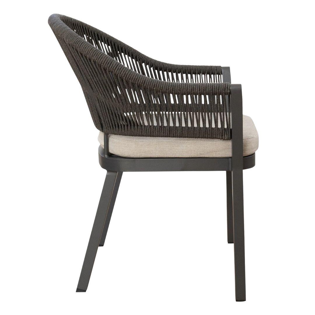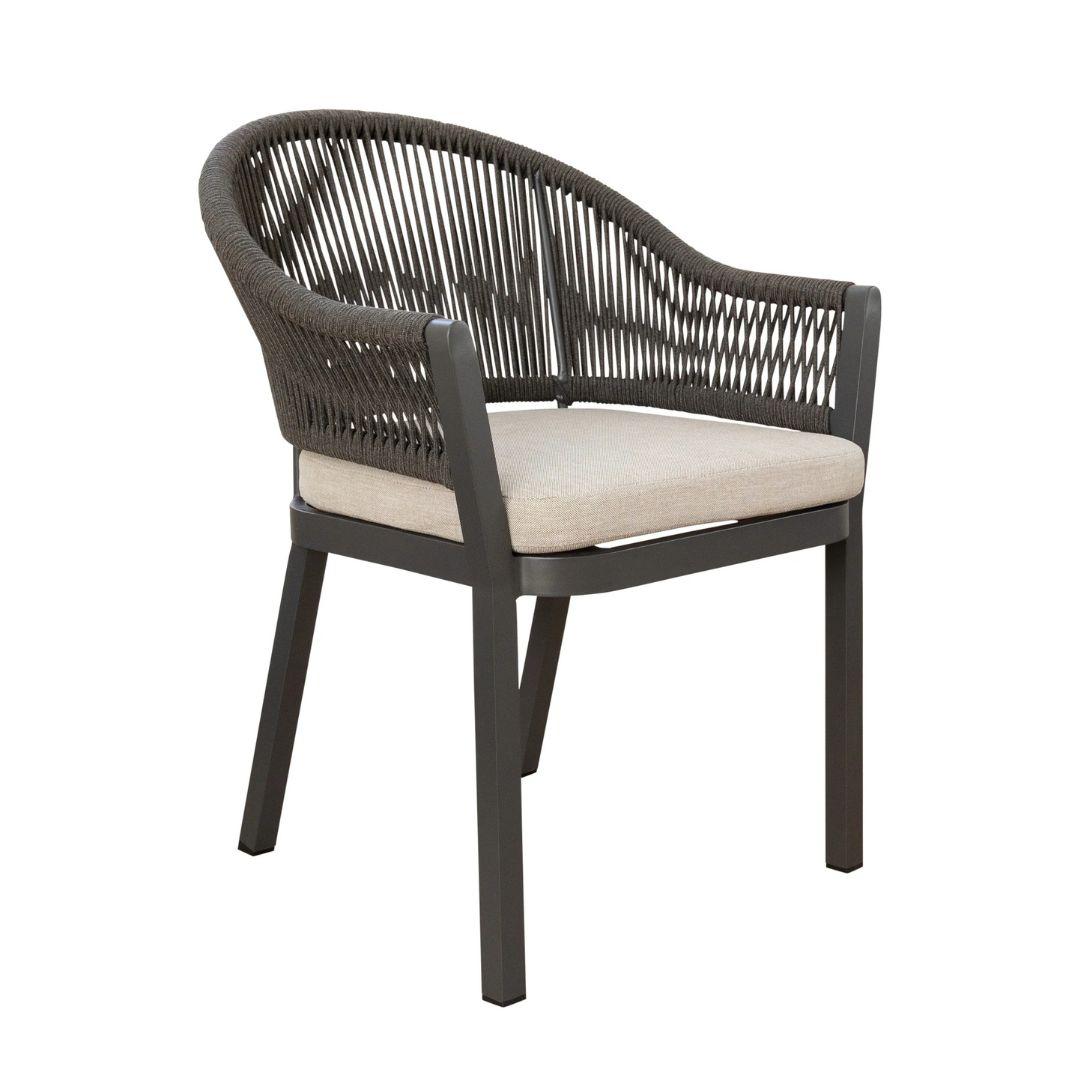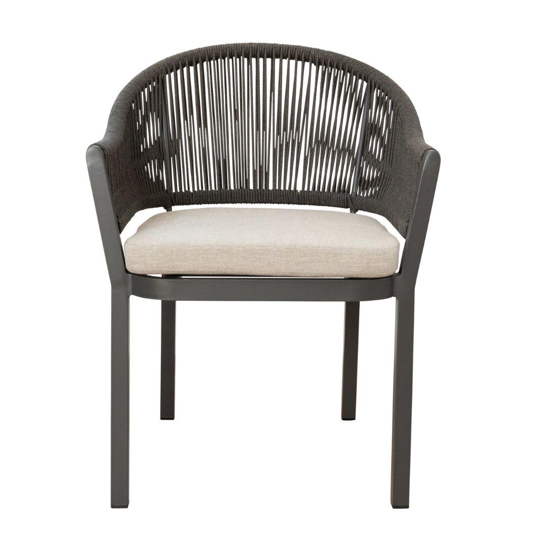 This outdoor chair is designed for comfort, durability, and convenience. It features a sturdy aluminium frame, rope accents, and a cushioned seat upholstered in 100% Olefin performance fabric for easy, stress-free cleaning. Perfect for patios, gardens, or alfresco dining, it requires no assembly and its stackable design allows for effortless storage. Made with all-weather materials, this chair is built to last, simply cover or store indoors during inclement weather. Available in two stylish tones, it combines practical design with relaxed, modern outdoor seating.