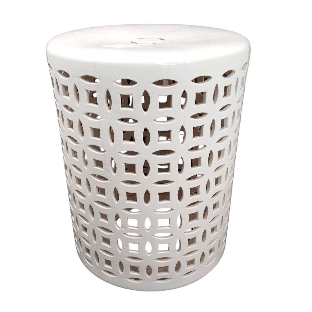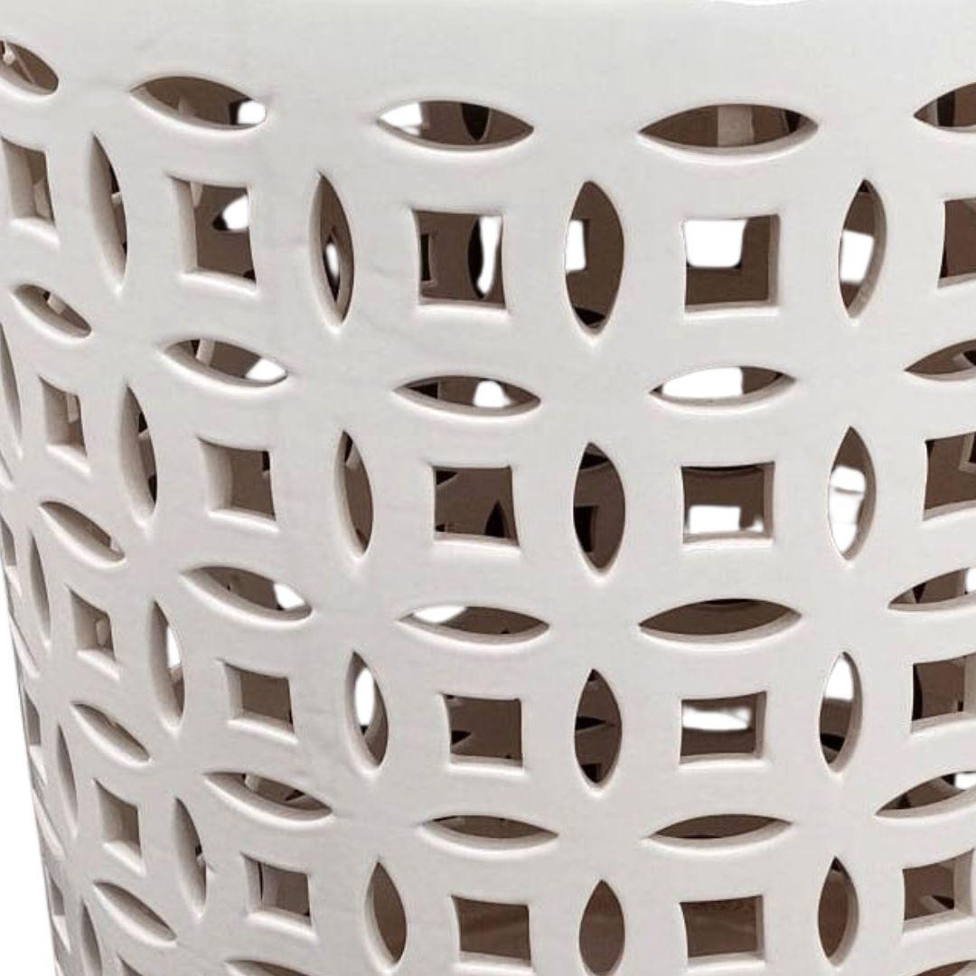 This elegant white ceramic stool showcases an intricate pierced geometric design, with cutouts arranged in symmetrical patterns that create a lace-like effect. The design allows light to filter through, casting delicate shadows while maintaining strength and durability. With its cylindrical shape and gently curved top featuring a central cutout, it is both sculptural and functional. Perfect as a decorative stool, it can also serve as a stylish side table for drinks or books, or as extra occasional seating. Its versatile finish makes it easy to style in living rooms, bathrooms, or outdoor spaces.