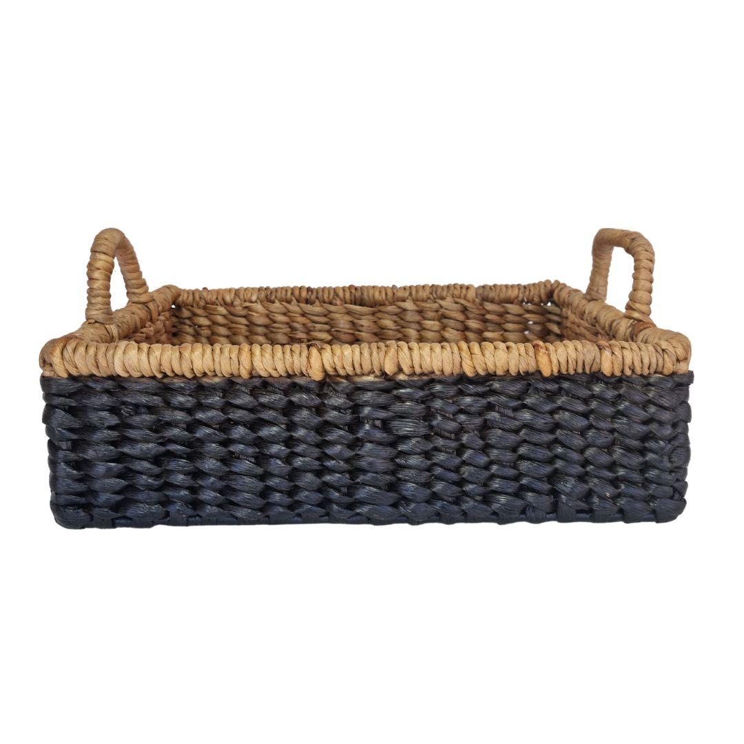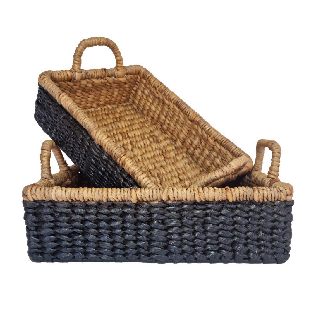 These rectangular woven baskets with handles bring natural warmth and practical organization to any room. Handcrafted from water hyacinth, each tray features a striking black woven exterior paired with a natural toned interior and rim. The sturdy handles make these woven storage baskets easy to carry and reposition, while the nested design allows for compact storage when not in use. Sold as a coordinated set, these basket trays create a cohesive look while offering flexible display and organization throughout your home.